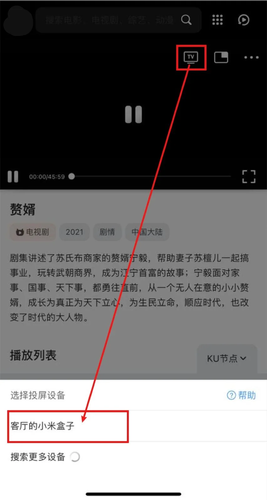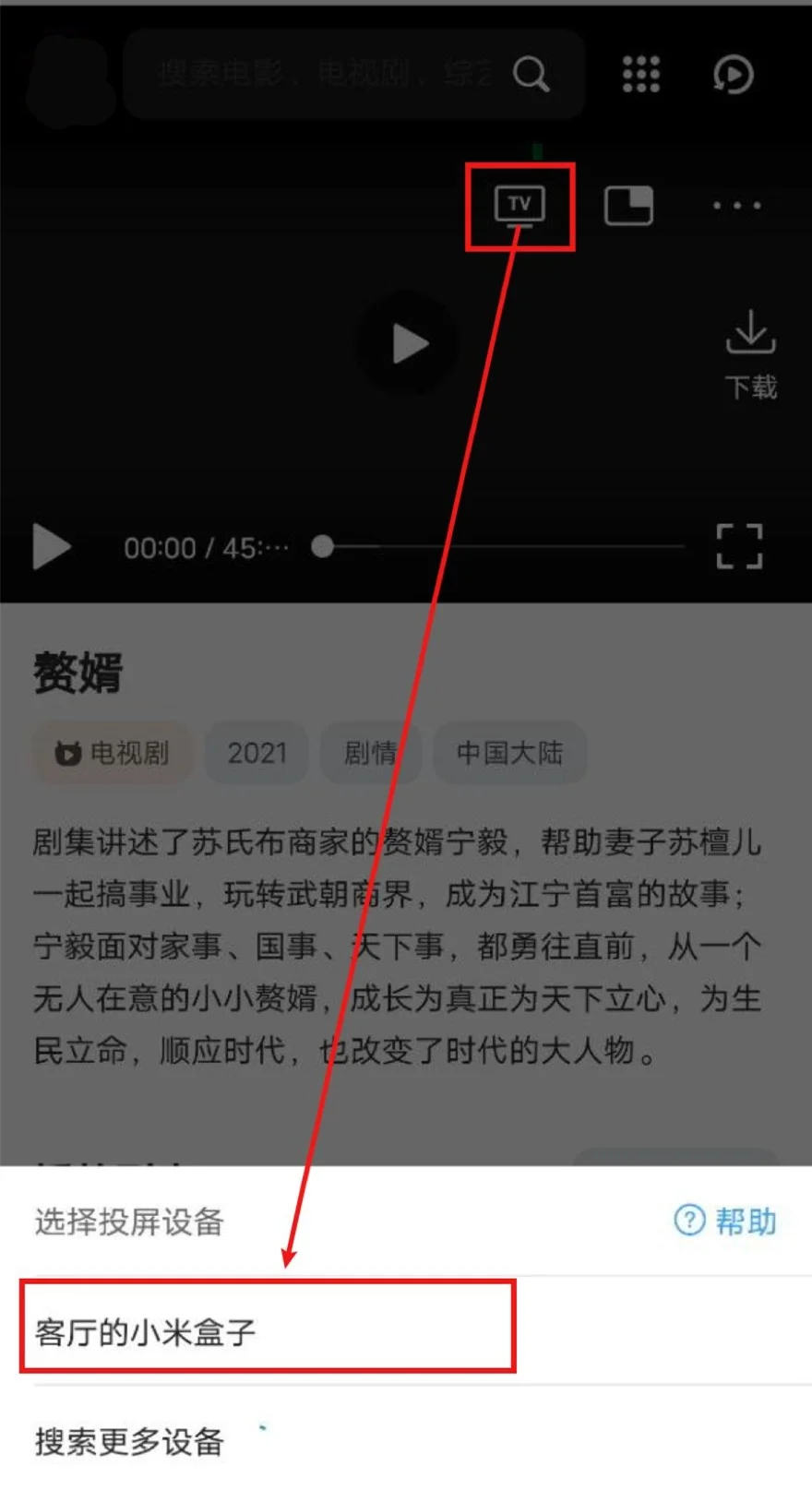 打开QQ浏览器(会接管网页播放器)->打开影视->播放视频->选中投屏图标->等待搜寻出智能电视/电视盒子->选中,即可投屏。
